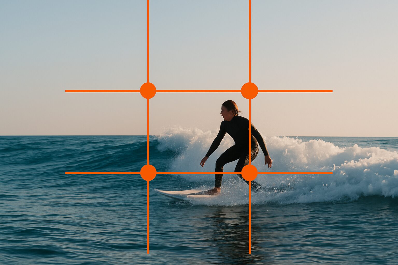 In the photo above, you will see the Rule of Thirds being used effectively. The surfer is positioned along the right vertical line of the grid, with their head and upper body landing near one of the key intersection points. This off-center placement instantly makes the composition feel more balanced and visually interesting. It also creates a sense of motion—the space in front of the surfer gives your eye a direction to follow, almost like you're riding the wave with them. This is a good example of how using the Rule of Thirds can add energy, flow, and storytelling to a photo—all without needing any fancy gear or editing tricks.